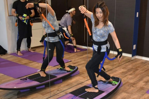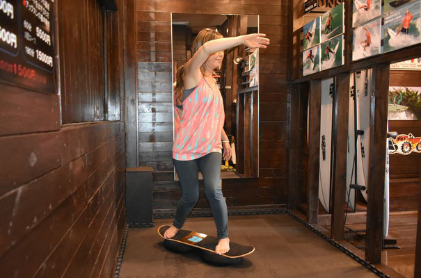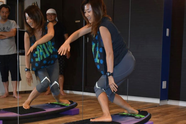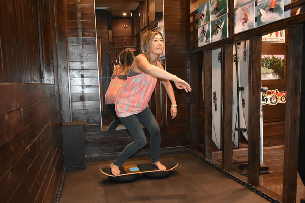 ボードに立つ足の向きからヒザの使い方、そして上半身の動かし方などを鏡をみながら調整していくことで、だんだんコツがつかめていきます。