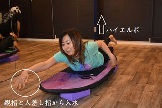 ボードの上に正しく寝そべる形やパドリングのスピードを出せるやり方。基礎中の基礎から練習していきます。